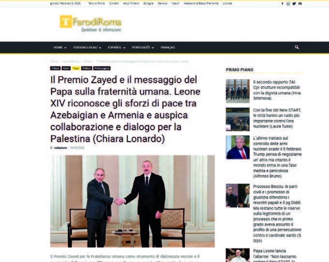 Azərbaycan Prezidentinin Əbu-Dabi səfəri İtaliyanın nüfuzlu media orqanlarında da işıqlandırılıb. Bu ölkənin “Notizie da Est”, “Latestata”, “Farodiroma”, “Parroççia” qəzetləri, həmçinin “Agenzie Nova” agentliyi Prezident İlham Əliyevə “Zayed İnsan Qardaşlığı Mükafatı”nın təqdim olunması, həmçinin dövlətimizin başçısının Ermənistanın Baş naziri ilə keçirdiyi görüş barədə materiallar dərc ediblər. Yazılarda qeyd olunub ki, Azərbaycan Prezidenti Ermənistanla 30 ildən artıq davam edən münaqişəyə son qoyub, bununla da Cənubi Qafqaz regionunun inkişafına töhfə verir. Vurğulanıb ki, məhz sülh istiqamətində səylərinə görə Prezident İlham Əliyev və Ermənistanın Baş naziri Nikol Paşinyan bu nüfuzlu mükafata layiq görülüblər.