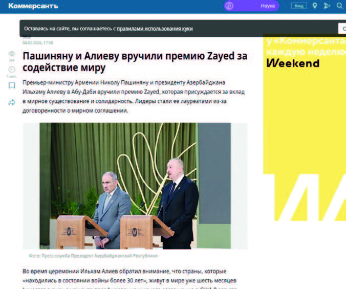 Prezident İlham Əliyevin Əbu-Dabidə “Zayed İnsan Qardaşlığı Mükafatı”na layiq görülməsi və dövlətimizin başçısının çıxışından sitatlar Rusiyanın “Kommersant” qəzeti, “RİA Novosti” agentliyi, “News.ru” portalının materiallarında da yer alıb. Rusiya mətbuatı qeyd edib ki, mərasimdə İlham Əliyev 30 ildən çox müharibə aparan ölkələrin artıq altı aydır ki, sülh şəraitində yaşadıqlarını bildirib (8 avqust 2025-ci ildə ABŞ-da sülh müqaviləsinin paraflanmasına istinad edir). “Dəfələrlə qeyd etdiyim kimi, biz sülh şəraitində yaşamağı öyrənirik. Sizə deyə bilərəm ki, bu, xüsusi bir hissdir. Biz müstəqillik əldə edəndən bəri heç vaxt sülh şəraitində yaşamamışıq və indi bunu sürətlə öyrənirik. ABŞ Prezidenti Donald Trampın Vaşinqtonda ev sahibliyi etdiyi tarixi Zirvə Görüşündən sonrakı altı ay tərəfdaşlıq, əməkdaşlıq və uzunmüddətli, dayanıqlı sülhə doğru irəliləyiş ayları olmuşdur”, - deyə Azərbaycanın lideri vurğulayıb.