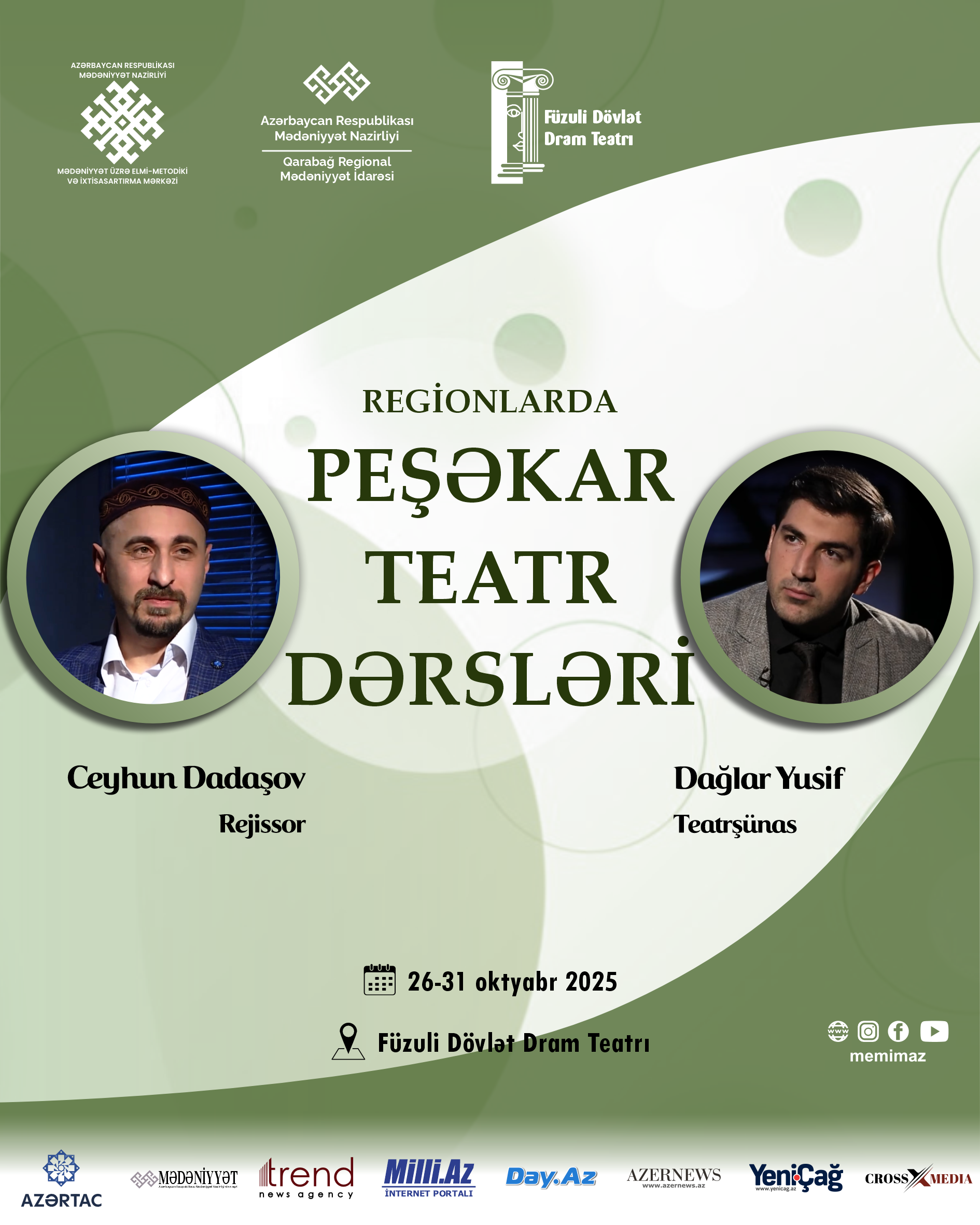 20-25 oktyabr tarixlərində Ağdam Dövlət Dram Teatrında, 26-31 oktyabr tarixlərində isə Füzuli Dövlət Dram Teatrında “Regionlarda peşəkar teatr dərsləri” adlı silsilə tədbirlər keçiriləcək.