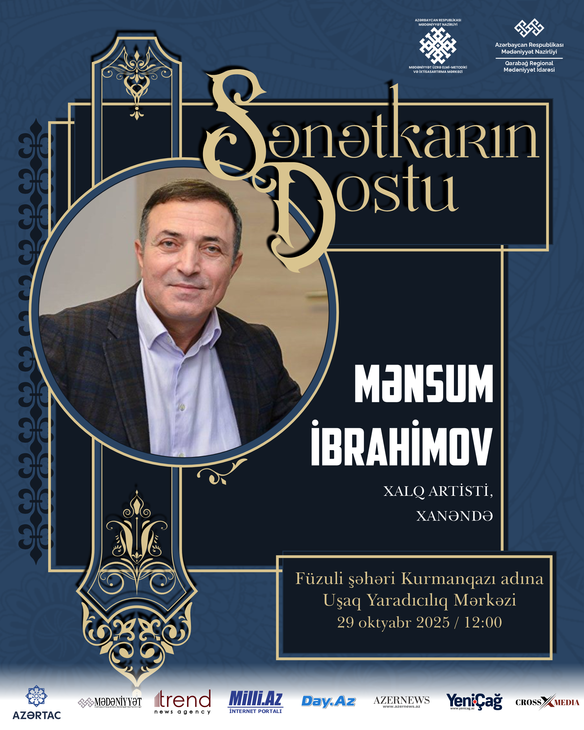 “Sənətkarın dostu” layihəsi çərçivəsində növbəti görüş 29 oktyabr tarixində Füzuli şəhərindəki Kurmanqazı adına Uşaq Yaradıcılıq Mərkəzində Xalq artisti, xanəndə, pedaqoq Mənsum İbrahimovun iştirakı ilə reallaşacaq.