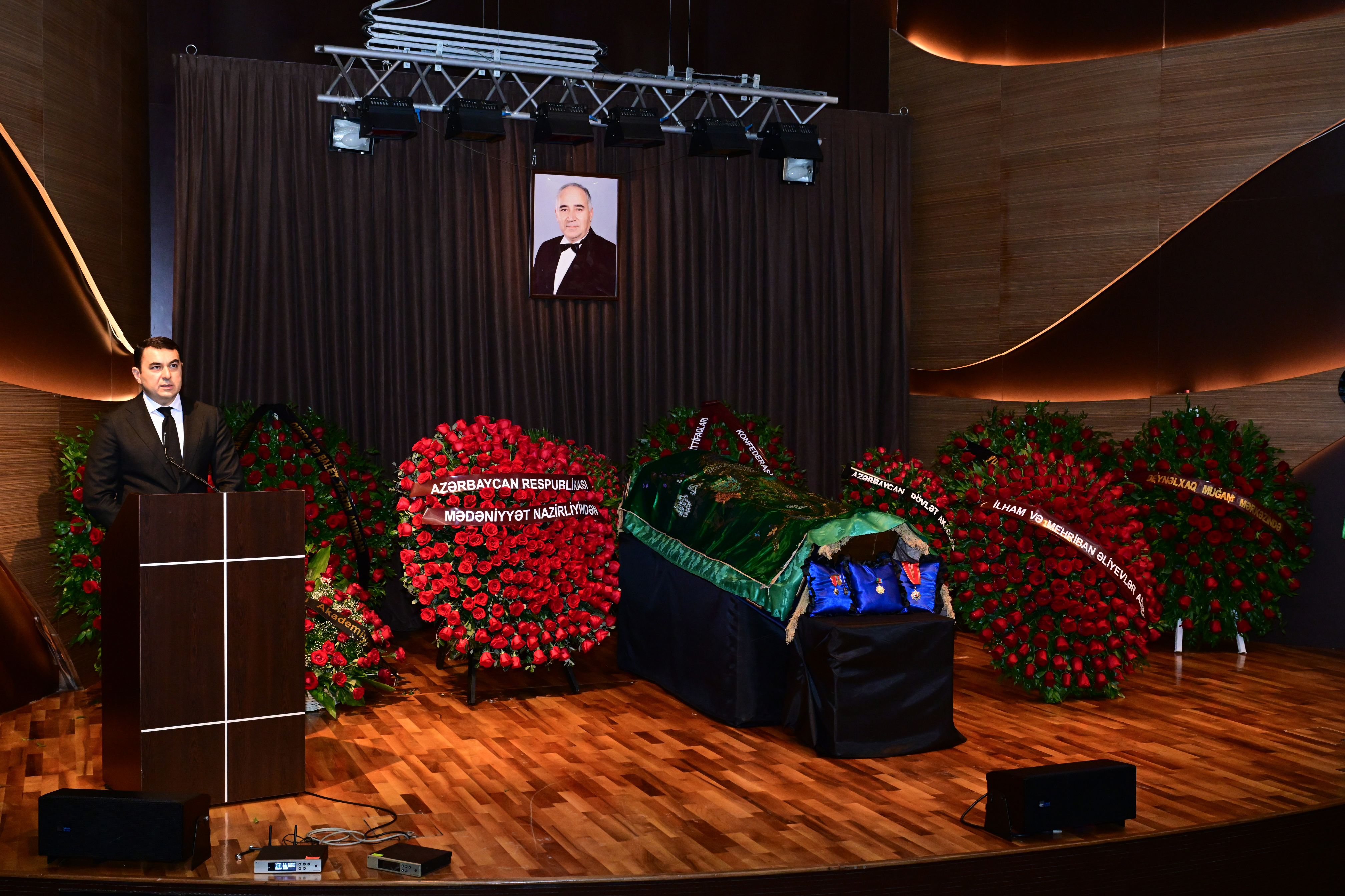 Mərhumun cənazəsi ətrafına Azərbaycan Prezidenti İlham Əliyev, Birinci vitse-prezident Mehriban Əliyeva, hökumət qurumları və müxtəlif kollektivlər adından əklillər düzülmüşdü.