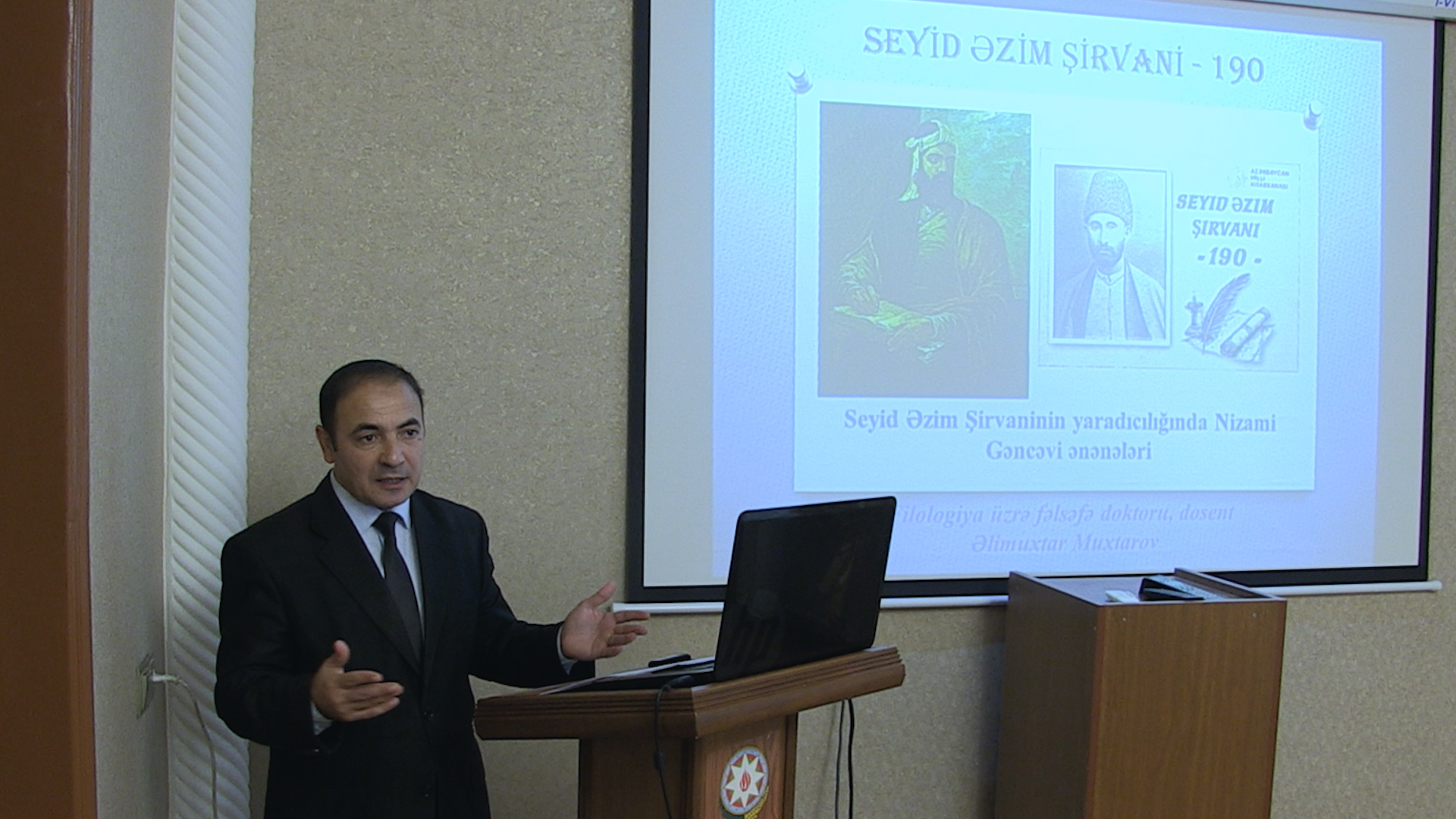 Seminarı AMEA-nın Gəncə Bölməsinin elmi işlər üzrə sədr müavini, filologiya üzrə fəlsəfə doktoru, dosent Əlimuxtar Muxtarov açaraq “Seyid Əzim Şirvaninin yaradıcılığında Nizami Gəncəvi ənənələri” adlı məruzə ilə çıxış edib.