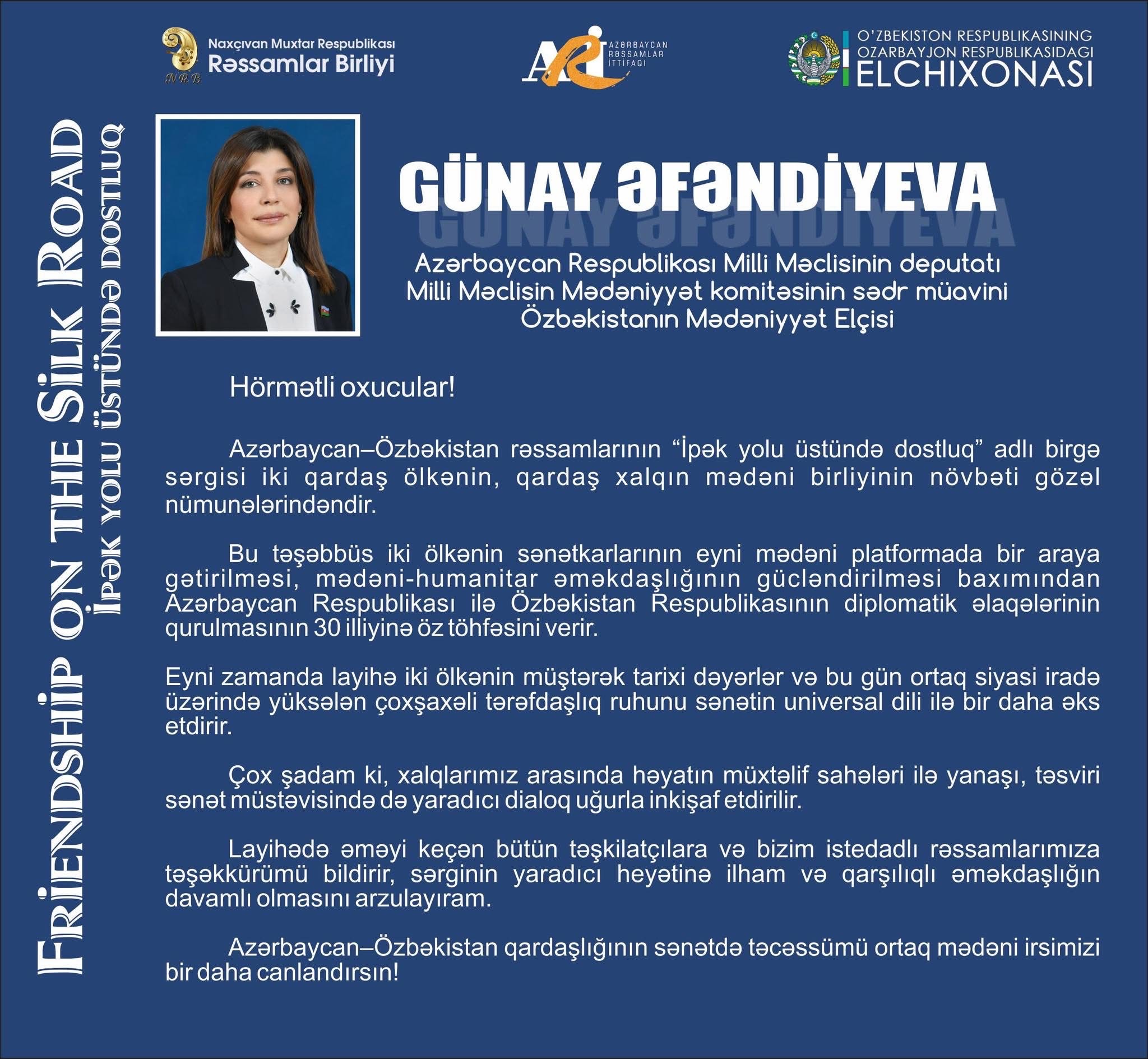Kataloq Azərbaycan Respublikasının Milli Məclisinin deputatı, Mədəniyyət komitəsinin sədr müavini, Özbəkistanın mədəniyyət elçisi Günay Əfəndiyevanın ön sözü ilə açılır. Qeyd olunur ki, Azərbaycan–Özbəkistan rəssamlarının “İpək yolu üstündə dostluq” adlı birgə sərgisi iki qardaş ölkənin, qardaş xalqın mədəni birliyinin növbəti gözəl nümunələrindəndir. Deputat iki ölkənin sənətkarlarının eyni mədəni platformada bir araya gətirilməsinin, mədəni-humanitar əməkdaşlığın gücləndirilməsinin önəminə diqqət çəkib.
