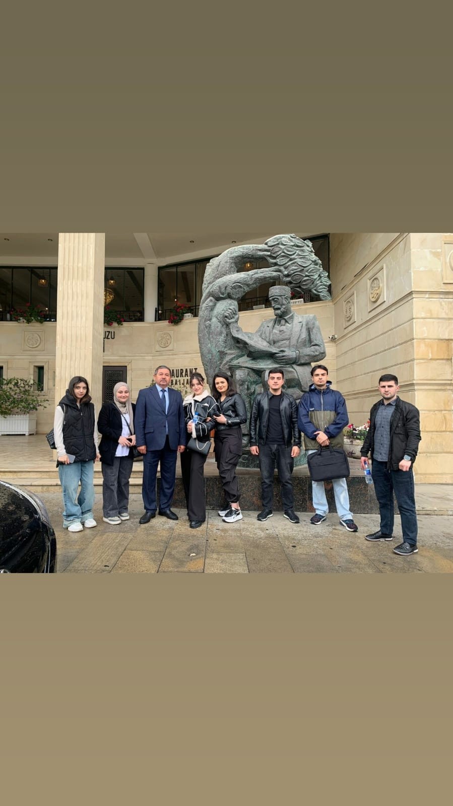 Eldəniz Həsənov – tələbələri ilə “İçərişəhər”də ekskursiyada olarkən Qala Qapısı küçəsində Həsən bəy Zərdabinin abidəsi önündə və ona məxsus olmuş mənzilin qarşısında (2023-cü il).