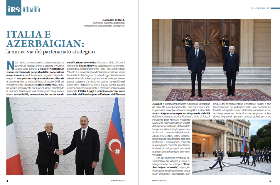 Nömrənin aktual materiallarından biri italiyalı jurnalist və geosiyasi analitik Domenico Letizia tərəfindən qələmə alınmış “İtaliya və Azərbaycan: strateji tərəfdaşlığın yeni yolu” sərlövhəli məqalədir. Müəllif yazısında Azərbaycan Prezidenti İlham Əliyevin İtaliyaya rəsmi səfərləri, İtaliya Prezidenti və Baş naziri ilə keçirdiyi görüşlər, eləcə də İtaliya Prezidentinin Azərbaycana səfəri çərçivəsində aparılan danışıqların ikitərəfli münasibətlərin inkişafına verdiyi töhfəni qeyd edir. Məqalədə bu yüksək səviyyəli təmasların enerji təhlükəsizliyi, iqtisadi əməkdaşlıq və regional sabitlik baxımından əhəmiyyəti vurğulanır.