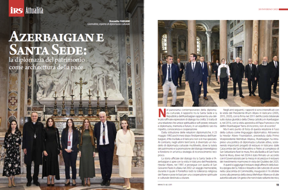 Jurnalın “Attualità” (Aktual mövzular) bölməsində diplomatik və mədəni jurnalistika üzrə ekspert Rossella Fabianinin “Azərbaycan və Müqəddəs Taxt-Tac: sülhün memarlığı kimi irs diplomatiyası” adlı məqaləsi yer alıb. Yazıda Azərbaycan Respublikasının Birinci vitse-prezidenti Mehriban Əliyevanın Vatikana səfərləri, Papa ilə görüşləri, Müqəddəs Taxt-Tac ilə Azərbaycan arasında mədəni-humanitar əməkdaşlığın inkişafında oynadığı mühüm rol geniş şəkildə işıqlandırılır. Məqalədə Heydər Əliyev Fondunun dəstəyi ilə Vatikan ərazisində həyata keçirilən bərpa layihələrinin dinlərarası dialoqun möhkəmləndirilməsinə verdiyi töhfə xüsusi vurğulanır.