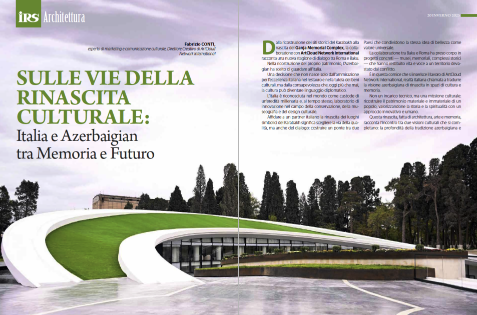 Memarlıq və mədəni irs mövzusuna həsr olunmuş bölmədə “ArtCloud Network International” şirkətinin kreativ direktoru, mədəniyyət marketinqi üzrə ekspert Fabrizio Continin məqaləsində Qarabağ və Gəncə şəhərlərində həyata keçirilən bərpa və memorial layihələr, o cümlədən Ağdamdakı İmarət Kompleksi, Gəncə Memorial Kompleksi və Şuşadakı tarixi-mədəni abidələrin yenidən qurulması prosesi təqdim edilir.