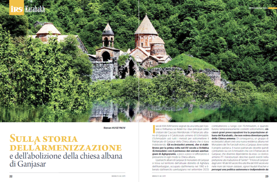 Jurnalın “Qarabağ” bölməsində Rizvan Hüseynovun məqaləsində Gəncəsər monastır kompleksinin Qafqaz Albaniyasına məxsus dini-memarlıq abidəsi olduğu elmi mənbələr və tarixi faktlar əsasında təqdim edilir. Yazıda ermənilər tərəfindən Gəncəsər Alban kilsəsinin mənşəyinin saxtalaşdırılması, onun erməni-qriqorian irsi kimi təqdim edilməsi cəhdləri konkret faktlarla ifşa olunur, bu təhriflərin bölgənin tarixi-mədəni irsinə qarşı yönəlmiş məqsədli siyasətin tərkib hissəsi olduğu qeyd edilir.