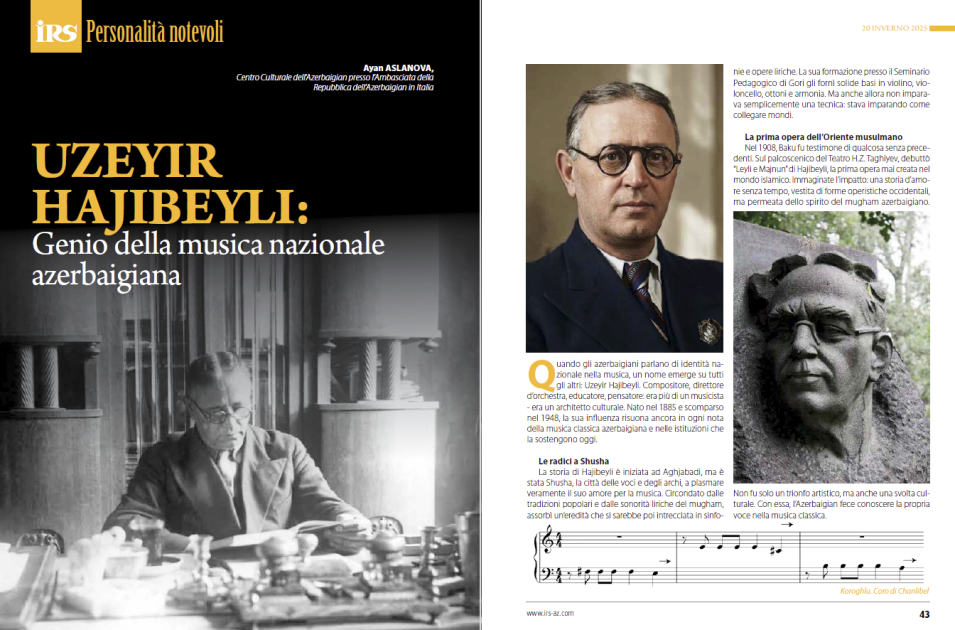 “Görkəmli şəxsiyyətlər” bölməsində İtaliyadakı Azərbaycan Mədəniyyət Mərkəzinin nümayəndəsi Ayan Aslanova tərəfindən hazırlanmış məqalədə dahi bəstəkar Üzeyir Hacıbəylinin həyat və yaradıcılığı, milli musiqi məktəbinin formalaşmasındakı müstəsna rolu və onun irsinin dünya mədəniyyətindəki yeri diqqətə çatdırılır.