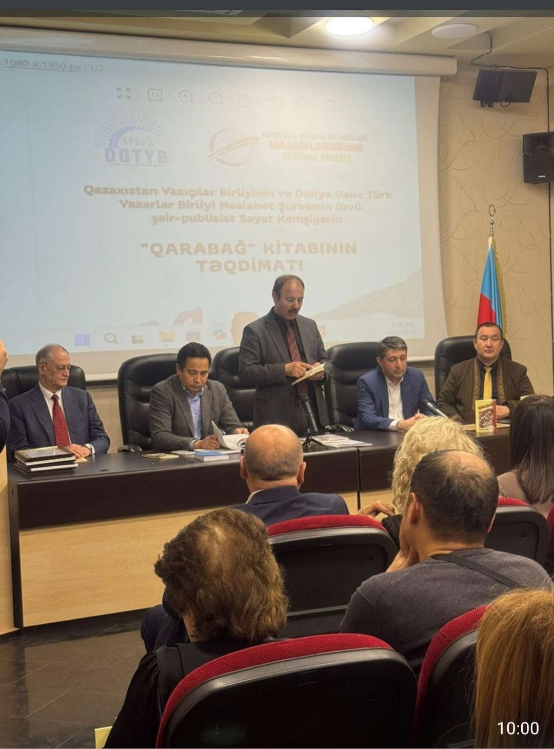 Milli QHT Forumunun mənzil-qərargahında Dünya Gənc Türk Yazarlar Birliyi (DGTYB) ilə Regional Hüquqi və İqtisadi Maarifləndirmə İctimai Birliyinin (RHİMİB) birgə təşkilatçılığı ilə Qazaxıstan Yazıçılar Birliyinin və DGTYB Məsləhət Şurasının üzvü, şair-publisist Sayat Kamşıgerin “Qarabağ” kitabının təqdimat mərasimi keçirilib.