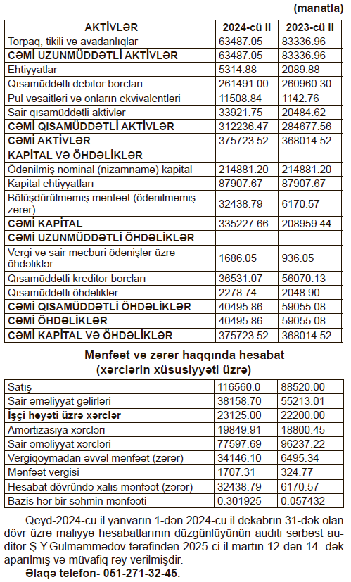 “Sumqayıt Sənayetikinti Avtonəqliyyat” ASC-nin 2024-cü il dekabrın 31-nə mühasibat balansı