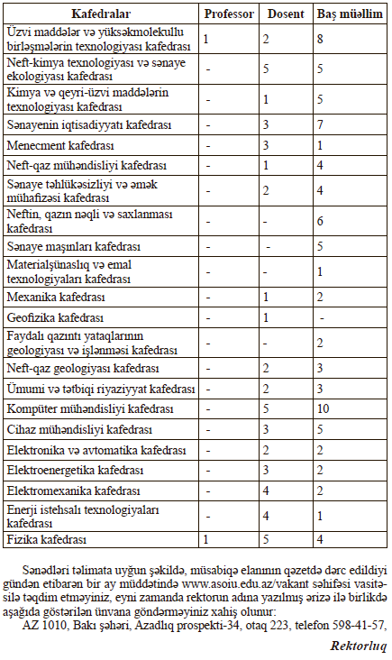 Azərbaycan Respublikası Elm və Təhsil Nazirliyi Azərbaycan Dövlət Neft və Sənaye Universiteti PHŞ aşağıdakı vakant vəzifələri tutmaq üçün müsabiqə elan edir