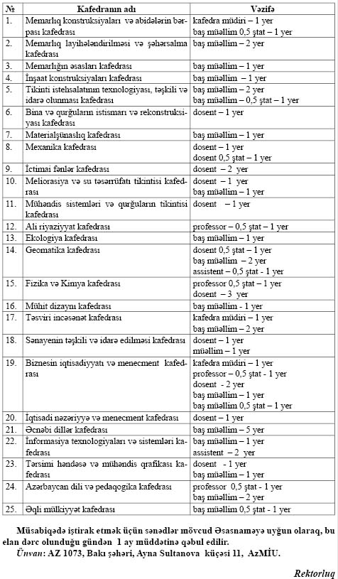 Azərbaycan Respublikası Elm və Təhsil Nazirliyi Azərbaycan Memarlıq və İnşaat Universiteti aşağıdakı vəzifələri tutmaq üçün müsabİqə elan edir