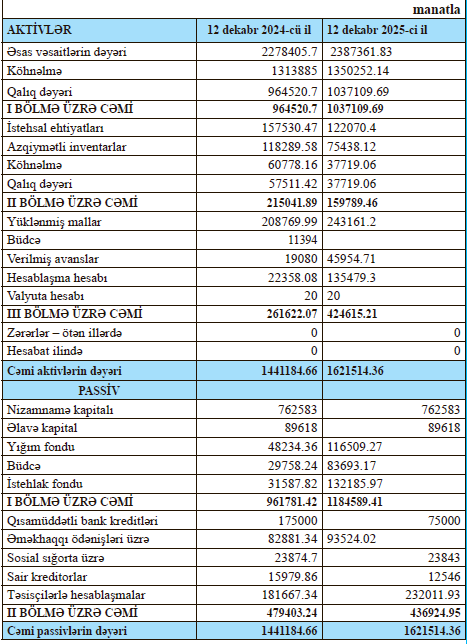 “Sumqayıt-Çörək”ASC-nin 2025-ci il dekabrın 31-nə mühasibat balansı