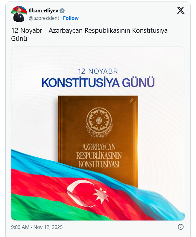 Prezident İlham Əliyev 12 Noyabr - Konstitusiya Günü ilə bağlı paylaşım edib.