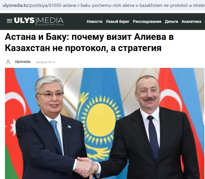 AZƏRTAC xəbər verir ki, “Ulysmedia.kz” portalında dərc olunan materialda Xəzər dənizi hövzəsində yeni strateji xəttin formalaşmasından bəhs olunur. Qeyd edilir ki, Qazaxıstan və Azərbaycan bu prosesdə bir-birini təkcə tərəfdaş kimi deyil, həm də Avrasiyanın formalaşan memarlığında əsas müttəfiqlər kimi görür.