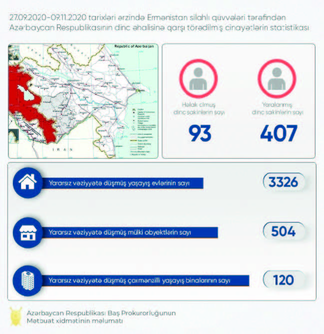 • Baş Prokurorluğun məlumatına görə, sentyabrın 27-dən noyabrın 9-dək Ermənistan silahlı qüvvələrinin yaşayış məntəqələrimizi ağır artilleriya qurğularından və raket sistemlərindən atəşə tutması nəticəsində mülki şəxslərdən 93 nəfər həlak olub, 407 nəfər isə xəsarət alıb. Bundan başqa, Ermənistan ordusunun intensiv ağır artilleriya və raket atəşi nəticəsində 3326 ev, 120 çoxmənzilli yaşayış binası və 504 mülki obyekt yararsız vəziyyətə düşüb.