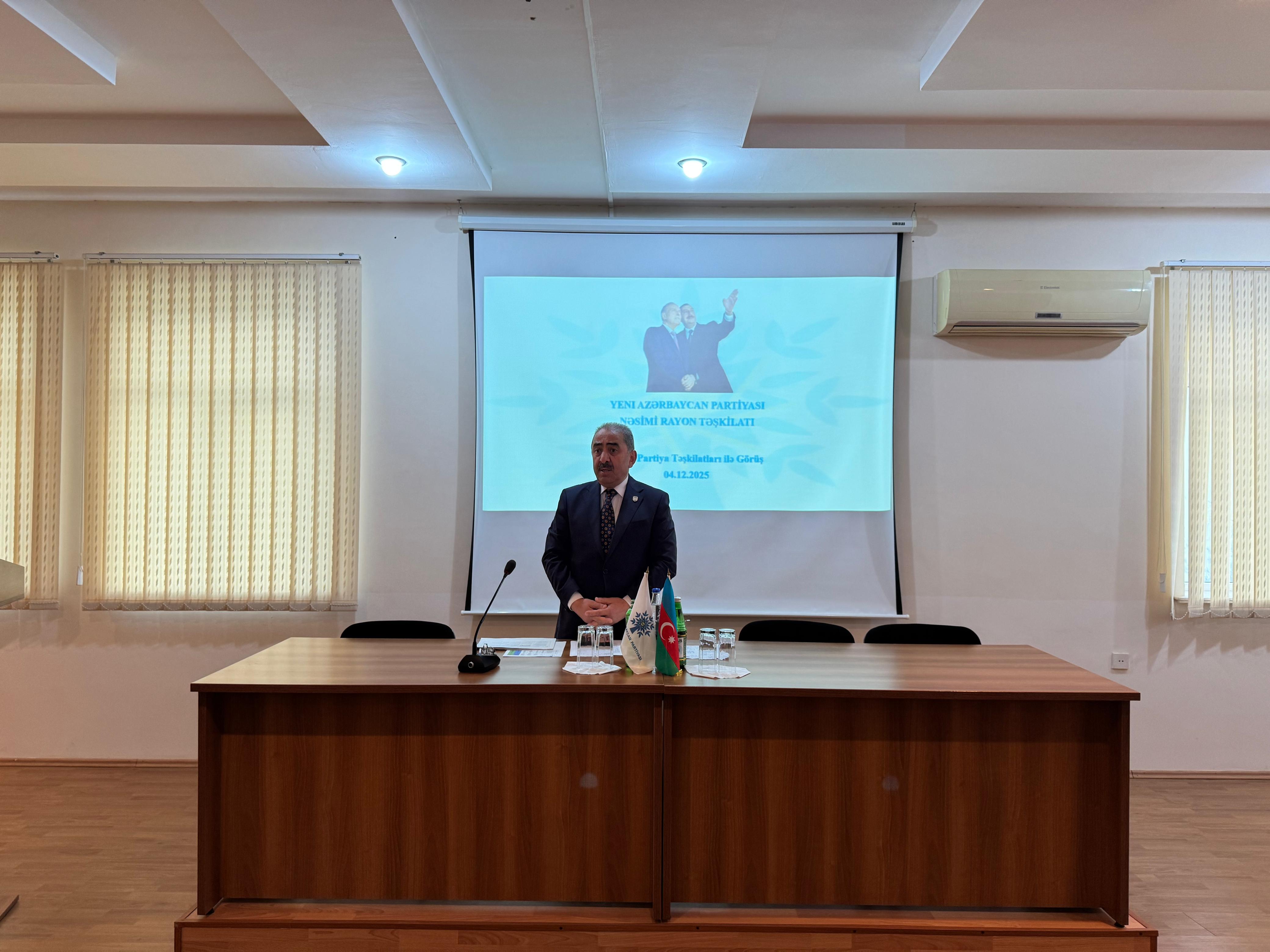 Görüşü giriş nitqi ilə açan YAP Nəsimi rayon təşkilatının sədri Azər Süleymanov yerli təşkilatın təşkilatı məsələləri ilə əlaqədar məsələləri qeyd edib. Bildirib ki, bu gün Ümummilli Liderin ideyalarını uğurla davam etdirən Prezident İlham Əliyevin rəhbərlik etdiyi YAP böyük gücə çevrilib, onun 760 minə yaxın üzvü var: “Bu üzvlərin böyük hissəsi gənclərdir ki, onlar da Azərbaycanın tarixi Zəfərinin qazanılmasında müstəsna rol oynadılar. Əsası məhz Ulu Öndər tərəfindən qoyulmuş ordu quruculuğu siyasəti yekunda öz müsbət nəticəsini verdi”.