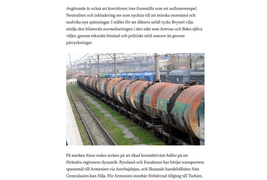 AZƏRTAC xəbər verir ki, məqalədə onilliklərlə davam edən qarşıdurmadan, bağlanmış sərhədlərdən və dağıdılmış infrastrukturdan sonra Cənubi Qafqazın tədricən yeni mərhələyə qədəm qoyduğu qeyd olunur. Söhbət qəfil barışıqdan deyil, praqmatik iqtisadi əməkdaşlığa əsaslanan tədricən yaxınlaşmadan gedir. Bu dəyişikliyin simvollarından biri onilliklər ərzində ilk dəfə olaraq Azərbaycan yanacağının Ermənistana dəmir yolu ilə çatdırılmasıdır.