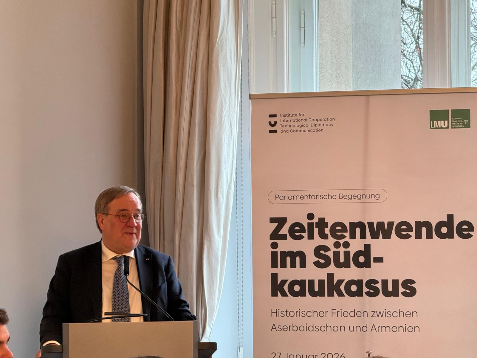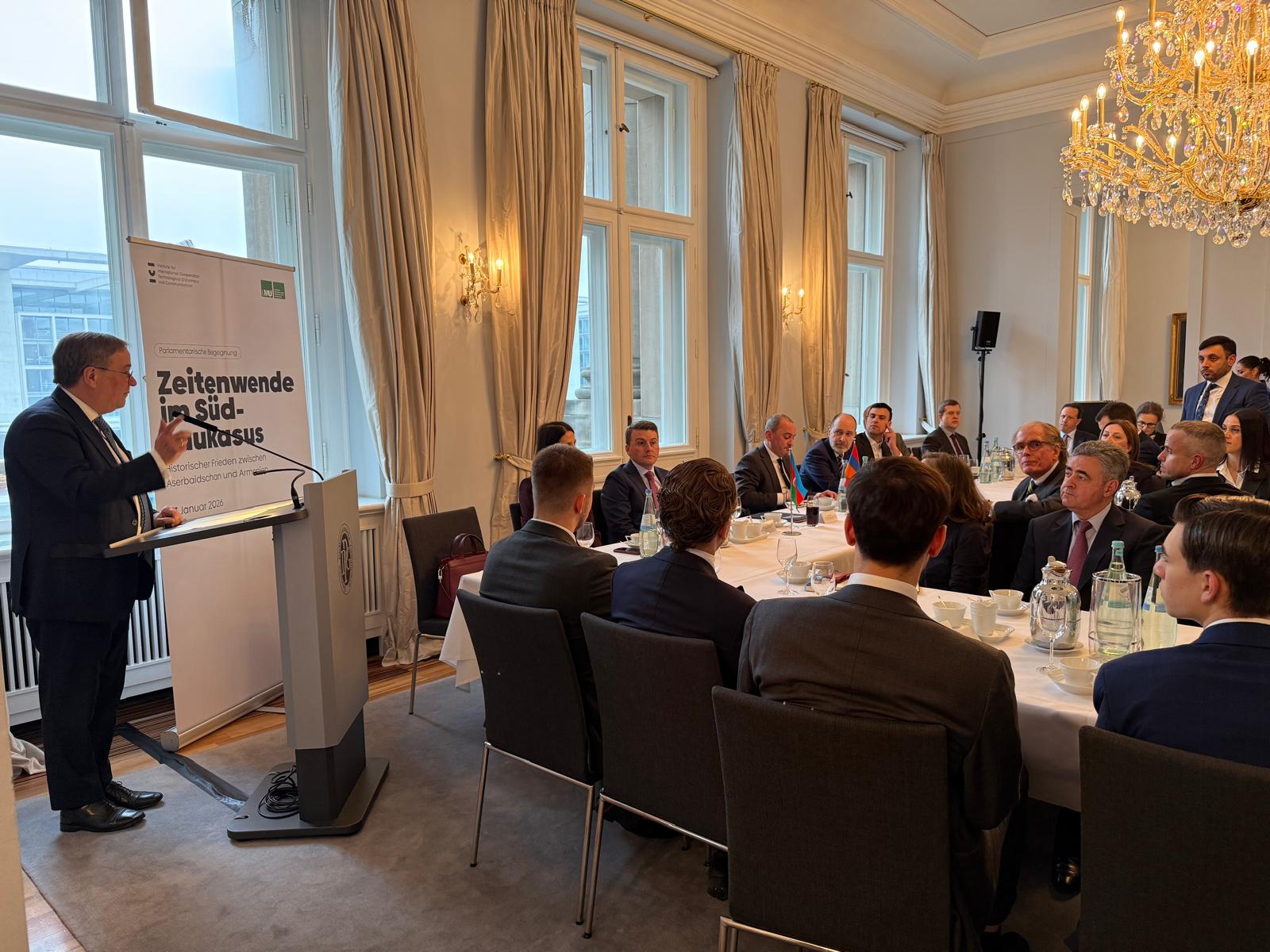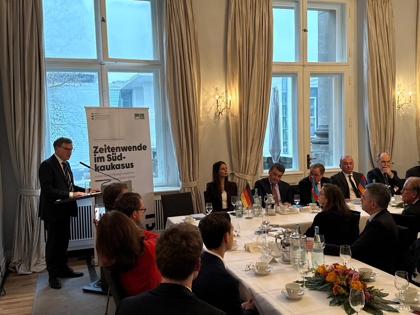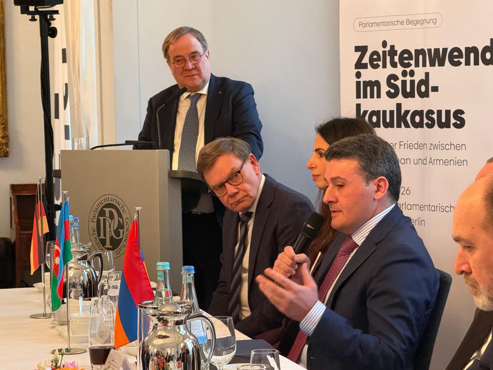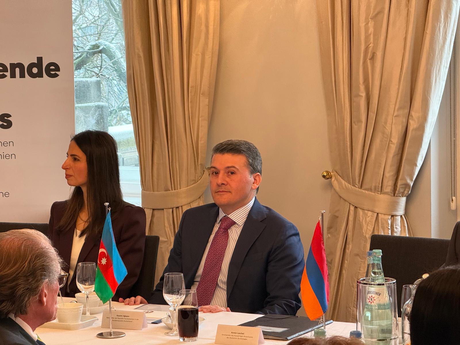 Bundestaqın xarici siyasət komitəsinin sədri Armin Laşet çıxışında hər iki ölkənin səfirlərinin iştirakı ilə Berlində belə bir tədbirin ilk dəfə keçirilməsini yüksək dəyərləndirib. O bildirib ki, bu proses təkcə Azərbaycan və Ermənistan üçün deyil, eyni zamanda, Almaniya üçün də önəmlidir, çünki Mərkəzi Asiyaya yeni nəqliyyat və dəmir yolu əlaqələri açılacaq ki, bu Avropa üçün də vacibdir. A.Laşet, həmçinin Almaniya Prezidenti Frank-Valter Ştaynmayerin ötən il Azərbaycana və Ermənistana ilk rəsmi səfərində iştirak etdiyini xatırladaraq, ölkəmizin zəngin tolerantlıq ənənələrini və bütün dinlərin nümayəndələrinin dinc şəkildə birgə yaşamasını xüsusi vurğulayıb.