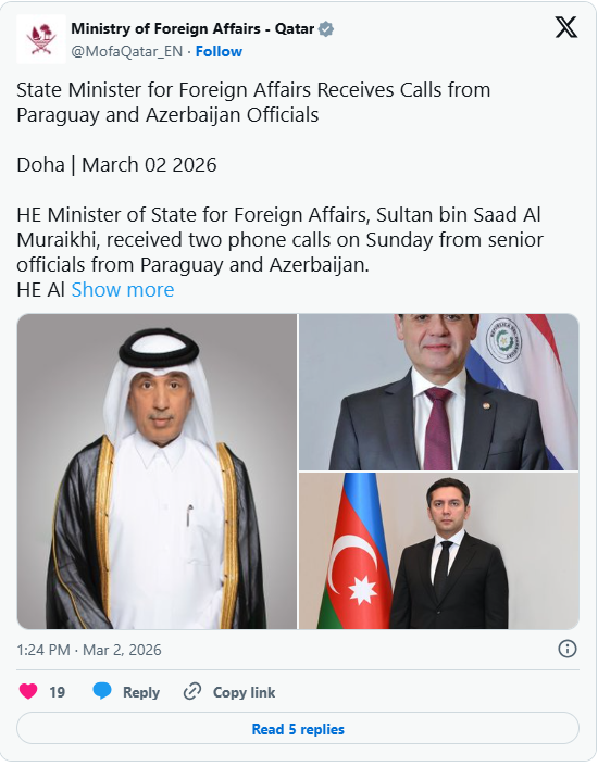 XQ xəbər verir ki, bu barədə Qətər Xarici İşlər Nazirliyi məlumat yayıb.