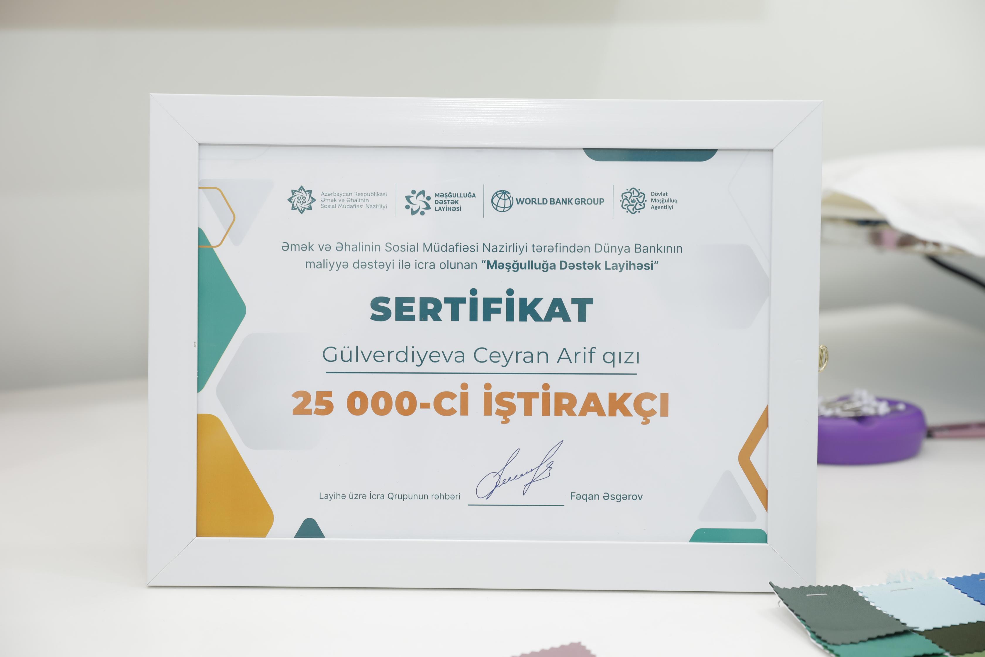 Layihənin 25 mininci iştirakçısı Bakı şəhər sakini Ceyran Gülverdiyevaya Layihə çərçivəsində aktivlər verilərək onun üçün dərzilik üzrə kiçik biznes qurulub. Həmçinin “Məşğulluğa Dəstək Layihəsi”nin 25 mininci iştirakçısı olması ilə əlaqədar ona Layihə tərəfindən sertifikat təqdim edilib.