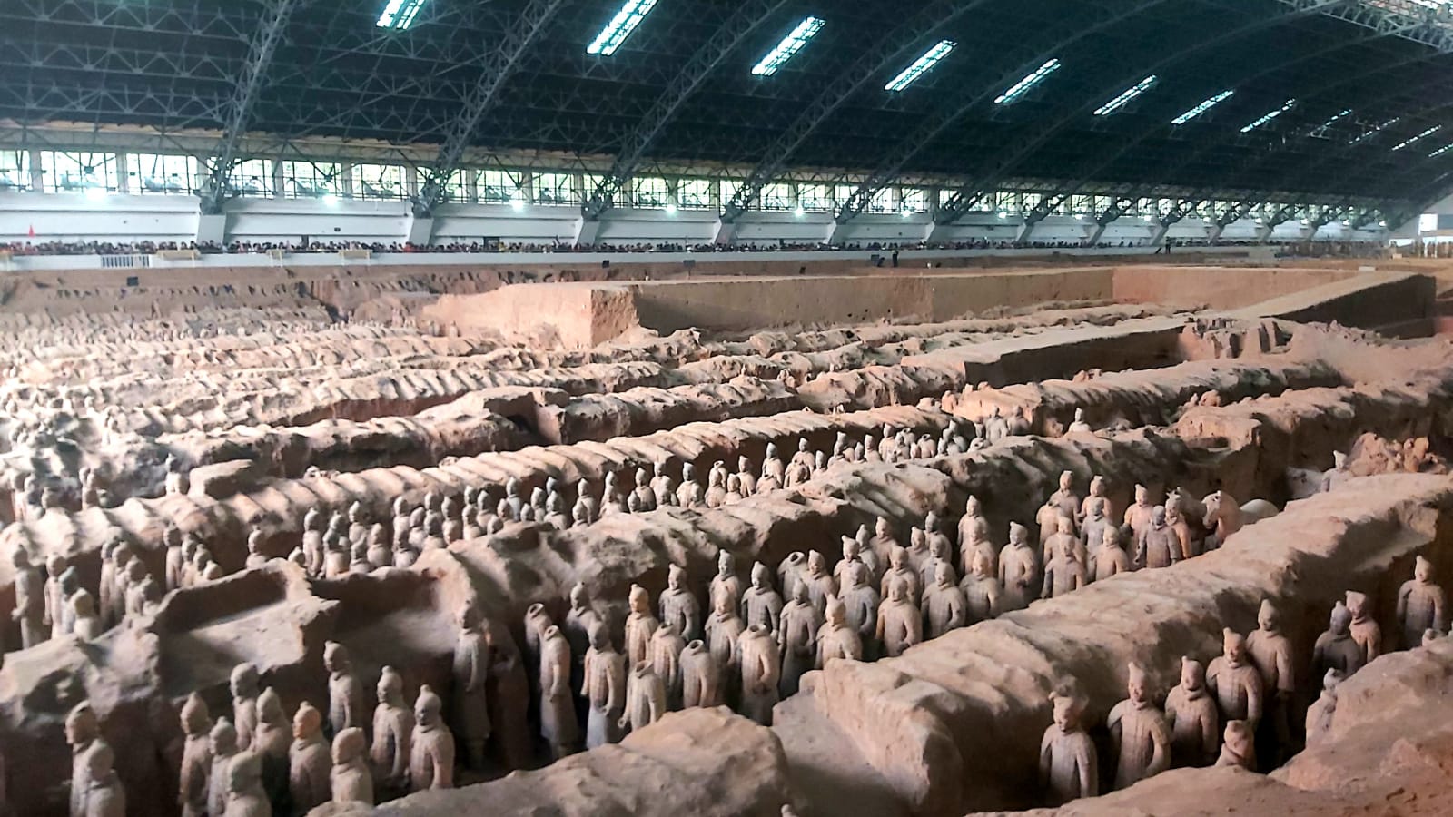 1974-cü ildə su axtarılarkən təsadüfən tapılan terrakota əsgərləri dünyanın ən böyük arxeoloji kəşflərindən biri sayılır. İki il sonra intensiv arxeoloji qazıntılar başlayıb və 8000-dən çox fiqurdan ibarət Terrakota Ordusu aşkar edilib. Gil döyüşçülərin yerləşdiyi yeraltı tikililərin 4 sektoru aşkar edilib və hər biri düzbucaqlı otaqdan ibarət olub. Ən böyüyü olan birinci sektor 14260 kvadratmetr sahəni tutur. Piyada və arabaçılar şərqə doğru döyüş mövqeyində düzülüblər. Bu günədək 8 mindən çox əsgər fiquru, atlar və yüzlərlə silah aşkar edilib. Kompleksin çox hissəsi hələ də açılmayıb, çünki arxeoloqlar abidənin zərər görməməsi üçün ehtiyatla işləyirlər. Maraqlıdır ki, 8 min əsgər heykəlin hər birinin sifət cizgiləri unikaldır, yəni heykəllər bir-birilərinə oxşamır! Heç iki fiqurun bir-birinin eyni olmadığı elmi tədqiqatlarla təsdiqlənib.