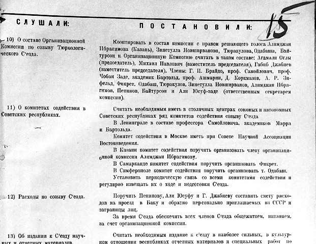 Türkologiya sahəsindəki fəaliyyət göstərən ayrı-ayrı şəxslərin öz işlərinin nəticələri və əldə olunan yeni nailiyyətlər, eləcə də ayrı-ayrı Sovet respublikalarında türkologiya üzrə görülmüş işlərin ümumi yekunları ilə bağlı xüsusi məruzələrin gündəliyə daxil edilməsinə etiraz edilməsin.