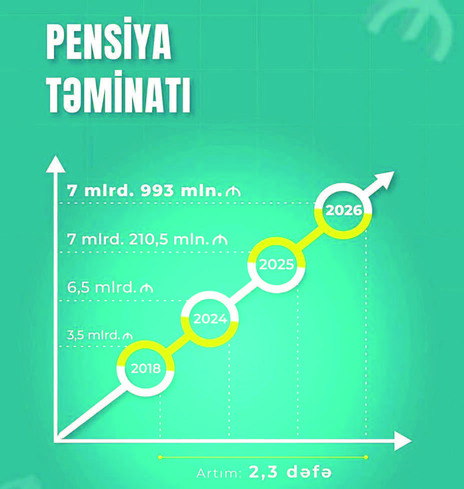 Son 7 ildə icra edilən 5 sosial islahat paketi 4 milyon insanı əhatə edib ki, bu məqsədlər üçün də təqribən 8 milyard manat vəsait sərf edilib. Həmin sosial islahat paketləri nəticəsində minimum pensiya 3 dəfəyədək artırılaraq 110 manatdan 320 manata çatdırılıb. Son illər bütün pensiyaların və pensiya kapitallarının hər il indeksləşdirilməsi də həyata keçirilib. Təkcə bu il pensiyaların indeksləşdirilərək artırılmasına 640 milyon manat vəsait ayrılıb və bu artımlar 1,1 milyon pensiyaçıya şamil olunub. Cari ilin I rübünün sonuna qeydə alınan rəqəmlərə əsasən pensiyaların orta məbləği 594 manat, yaşa görə orta aylıq pensiya məbləği isə 632 manat təşkil edir.