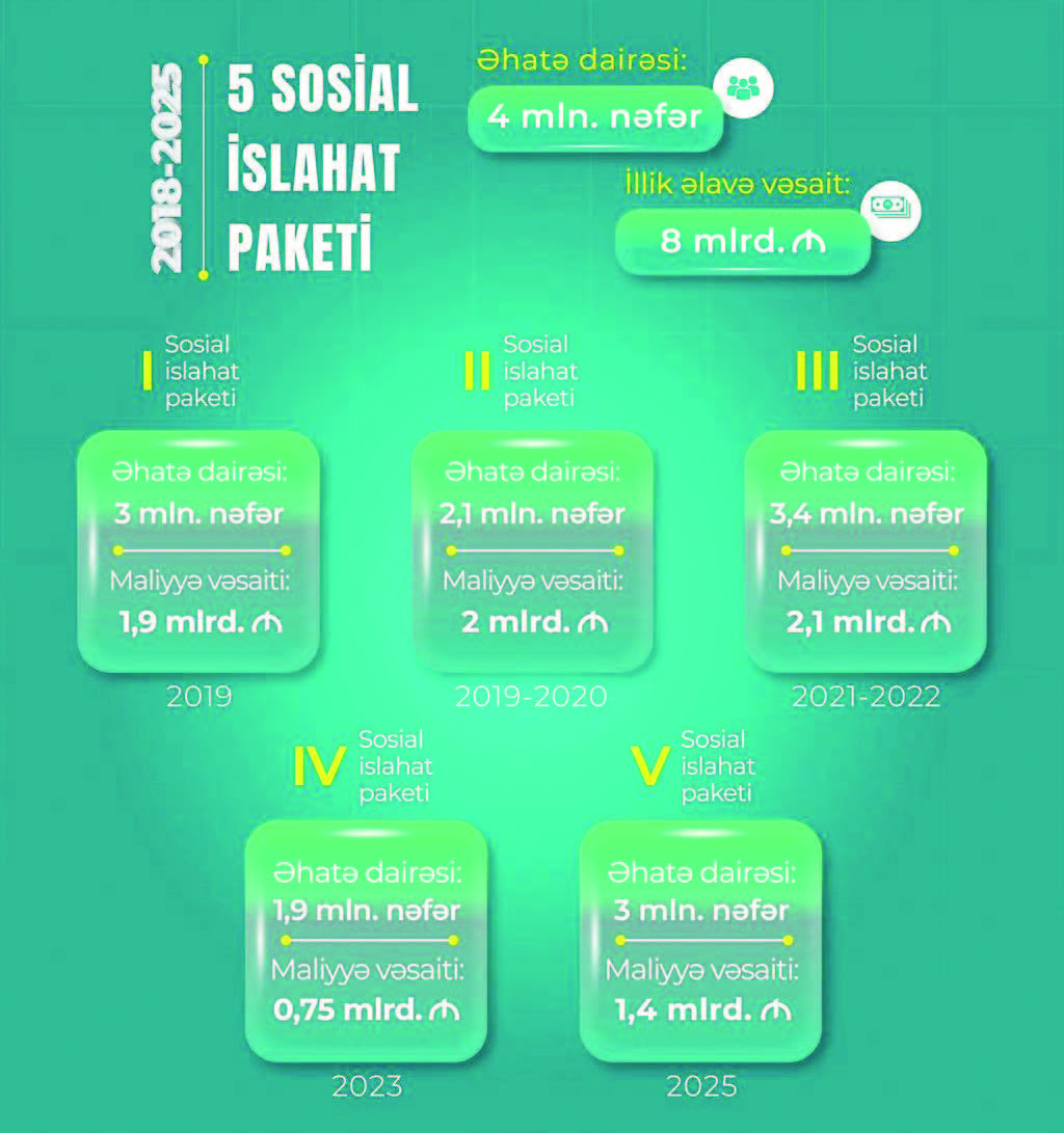 Qeyd olunan sosial islahat paketləri ilə sosial müavinət, təqaüd ödənişləri üçün ayrılan illik vəsaitdə 5 dəfə, ünvanlı yardımın hər ailəyə düşən orta aylıq məbləğində isə 2,4 dəfə artım olub. Bu sosial islahat paketləri yaşayış minimumunun da 65 faiz artırılaraq 173 manatdan ötən il 285 manata, ehtiyac meyarının 2,2 dəfə artırılaraq 130 manatdan ötən 285 manata çatdırılmasına imkan verib. 2026-cı il üçün isə yaşayış minimumu və ehtiyac meyarı 300 manatdır.