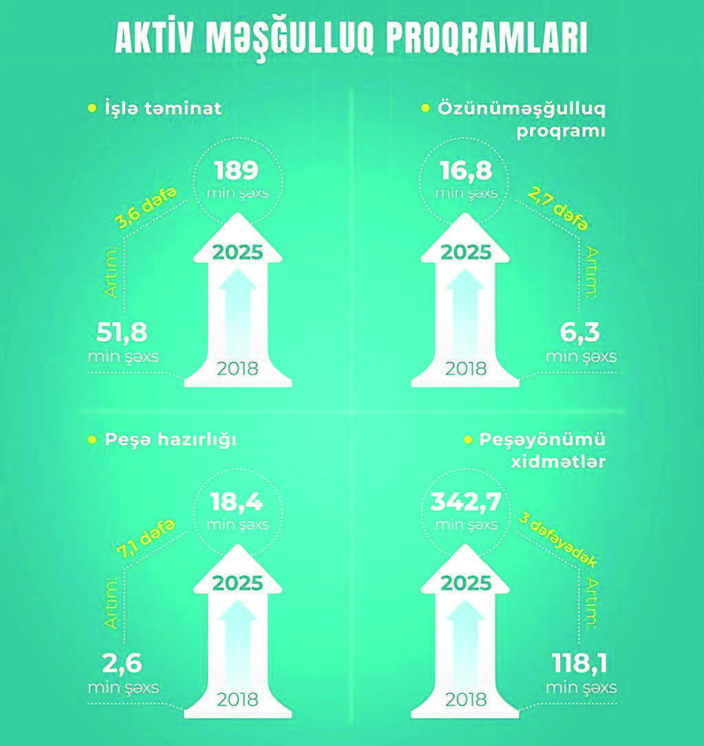 – Ölkəmizdə sosial müdafiə sisteminin inkişafı təkcə ödənişlərdəki artımlarla deyil, əhalinin məşğulluğunun, sosial təminatın, sosial xidmət və reabilitasiya sahələrində keyfiyyətin və xidmət istiqamətlərinin artırılması ilə də xarakterizə olunur. 2018-2025-ci illərdə 2,2 milyon nəfər Əmək və Əhalinin Sosial Müdafiəsi Nazirliyi tərəfindən aktiv məşğulluq tədbirlərinə cəlb olunub ki, onlardan da 836 min nəfəri münasib işlərlə təmin edilib. 56 min nəfər isə peşə hazırlığına yönəldilib. Bununla da 2018-ci ilə nisbətən 2025-ci ildə işlə təmin olunanların sayı 3,6 dəfə artıb. İşsiz və işaxtaran şəxslərin öz kiçik biznesini quraraq əmək bazarına çıxışına mühüm dəstək olan özünüməşğulluq proqramına cəlb olunanların sayı 2,7 dəfə artaraq 100 mindən çox olub.