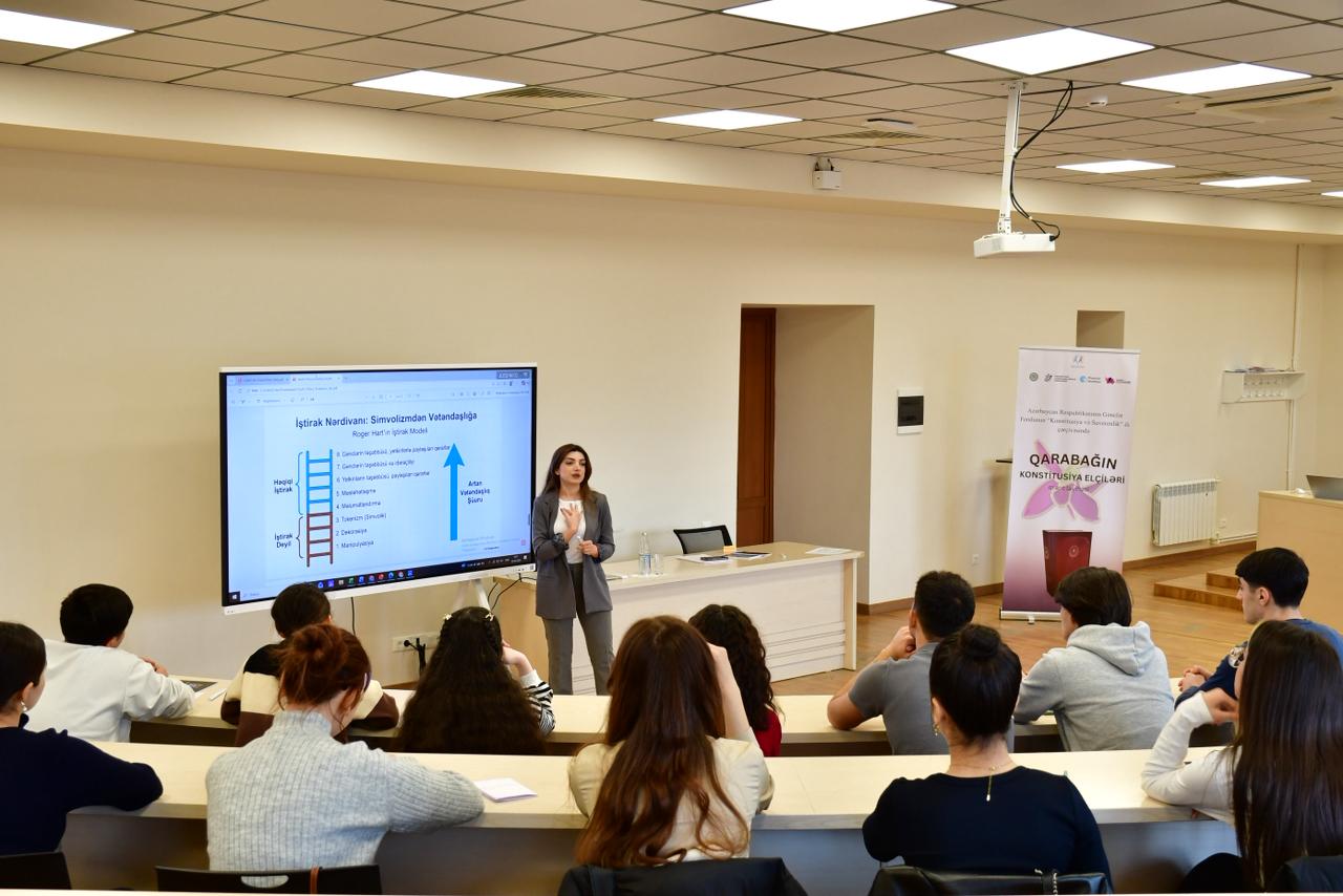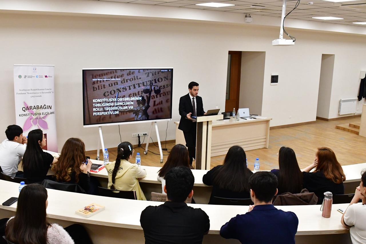 Azərbaycan Respublikasının Konstitusiyasının qəbul edilməsinin 30 illiyi və 44 günlük Vətən müharibəsində qazanılmış tarixi Zəfərin 5 illiyi münasibətilə Prezident İlham Əliyevin müvafiq sərəncamı ilə 2025-ci ilin “Konstitusiya və Suverenlik İli” elan olunması çərçivəsində Azərbaycan Respublikası Gənclər Fondu tərəfindən həyata keçirilən qrant müsabiqəsinin qaliblərindən olan “Qarabağın Konstitusiya Elçiləri” layihəsi Qarabağ Universitetində uğurla həyata keçirilmişdir.