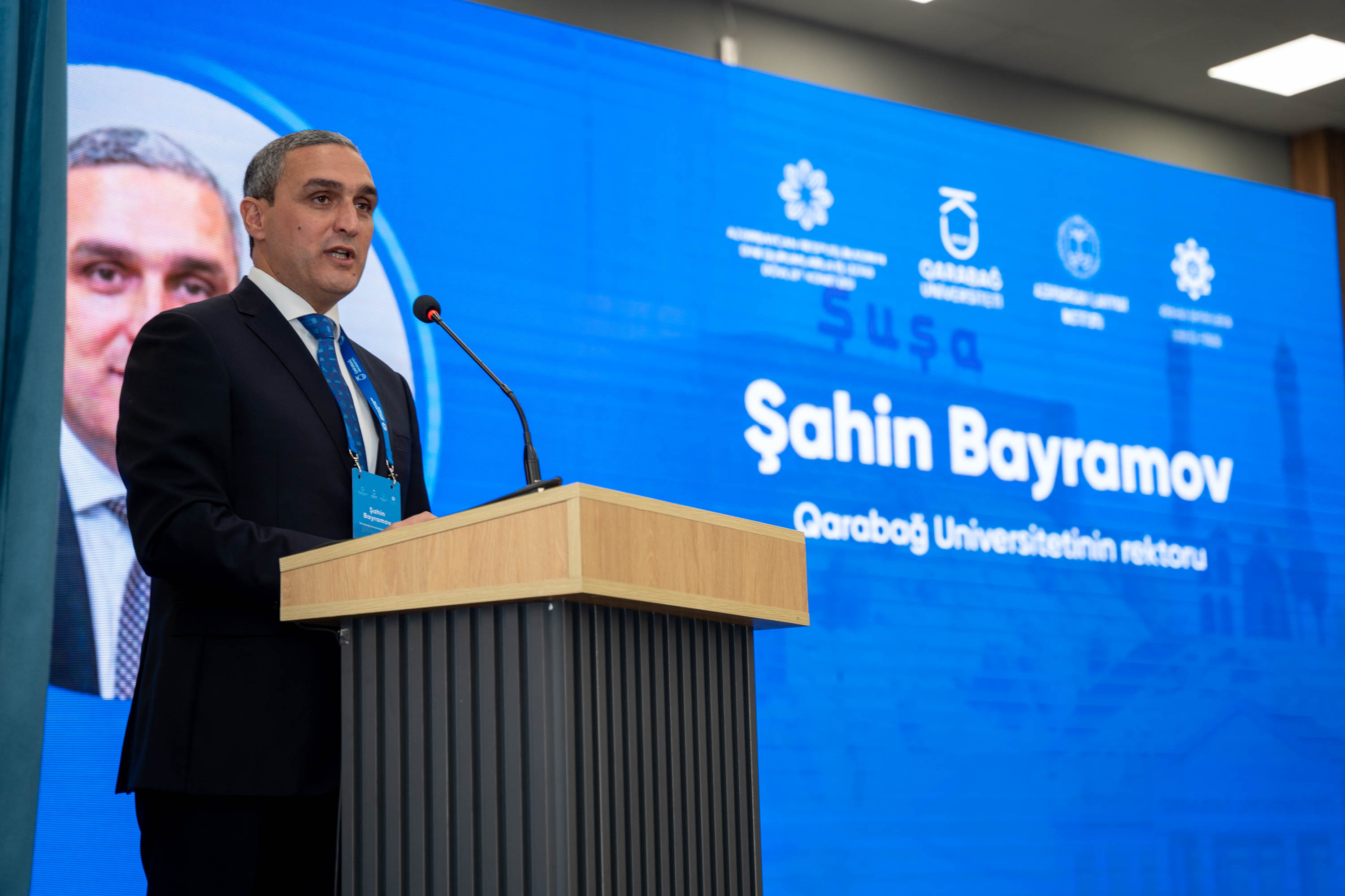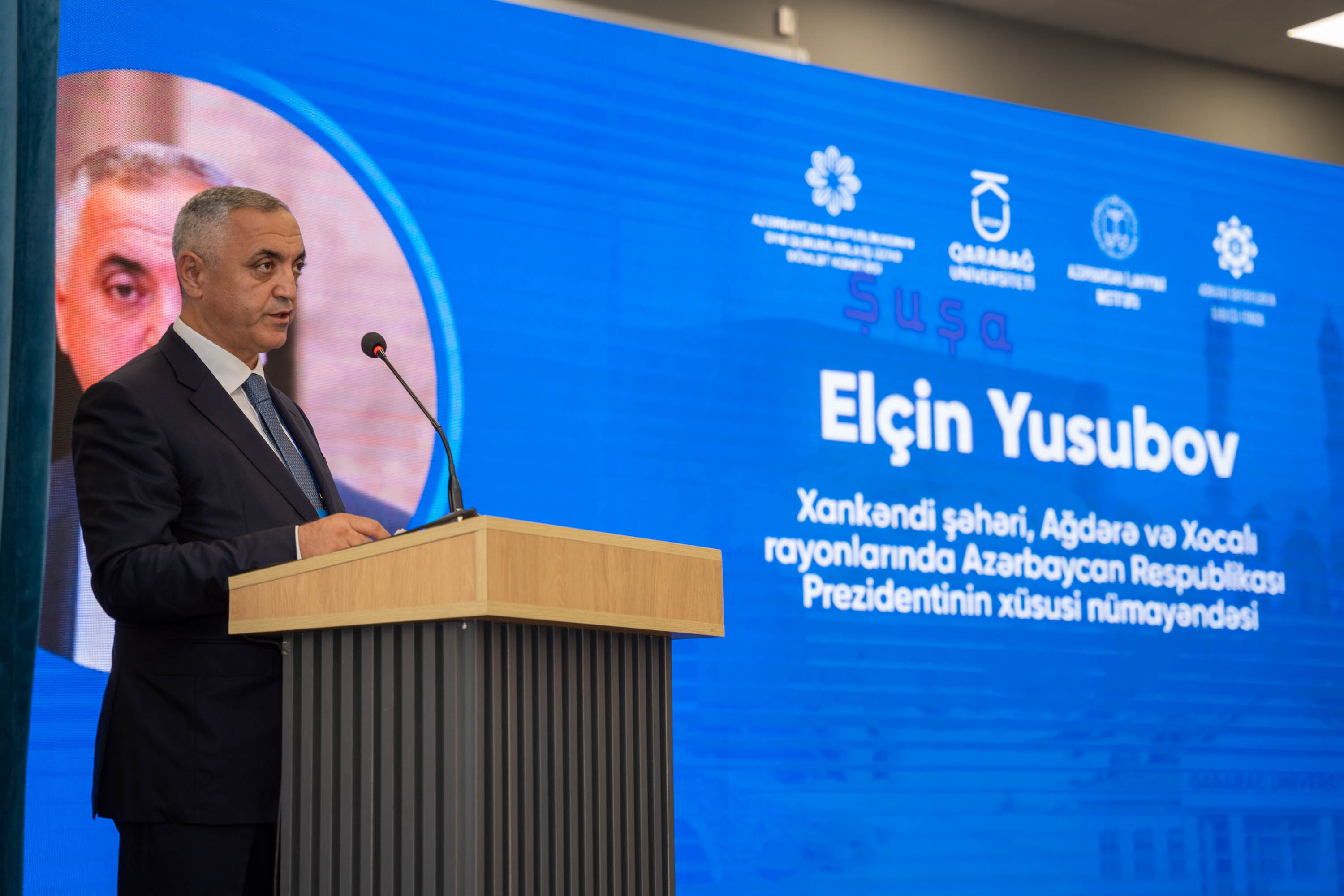 Qarabağ Universitetinin Filologiya kafedrasının müdiri, filologiya elmləri doktoru Əzizağa Nəcəfov “Qarabağın təhsil tarixi və Qarabağ Universiteti təhsilimizin yeni mərhələsi kimi” mövzusunda çıxış edib. O, Qarabağda təhsilin tarixi köklərindən, işğal dövründə itirilən mənəvi və elmi potensialdan, eyni zamanda Qarabağ Universitetinin bu boşluğu doldurmaqda oynadığı roldan danışıb.