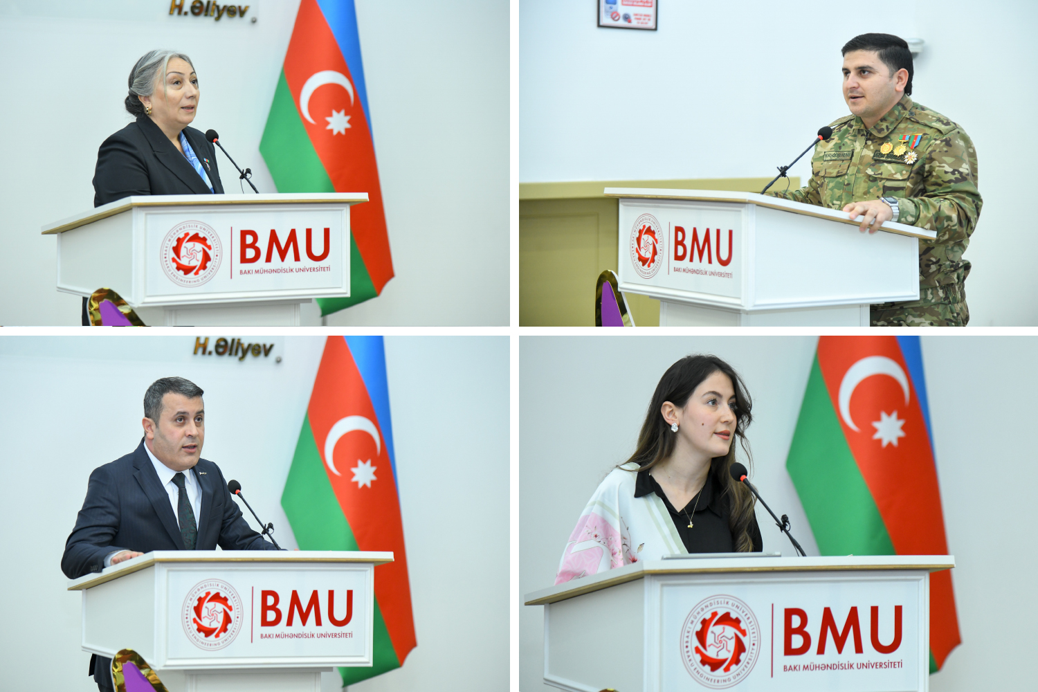 BMU-nun “Dövlət və bələdiyyə idarəetməsi” ixtisasının I kurs tələbəsi, 19 yaşında Azərbaycan Respublikasının ən ali hərbi təltifi - Vətən Müharibəsi Qəhrəmanı adına layiq görülmüş Azər Abdullazadə isə döyüş xatirələrini bölüşüb, şəhid silahdaşlarının ruhuna ehtiram ifadə edib və tələbə yoldaşlarını daim Vətənə sədaqət ruhunda olmağa səsləyib.