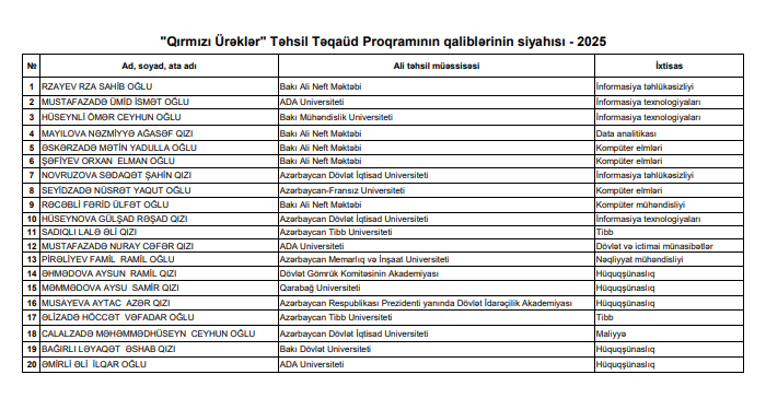 Seçim prosesinin bütün mərhələlərini uğurla tamamlayan 20 tələbə “Qırmızı Ürəklər” Təhsil Təqaüd Proqramının qalibi olub. Qaliblərdən 10 nəfər donor şirkətin kvotasına uyğun olaraq informasiya və kommunikasiya texnologiyaları sahəsində təhsil alan tələbələrdir. Digər 10 qalib isə ixtisas məhdudiyyəti tətbiq edilmədən seçilib.
